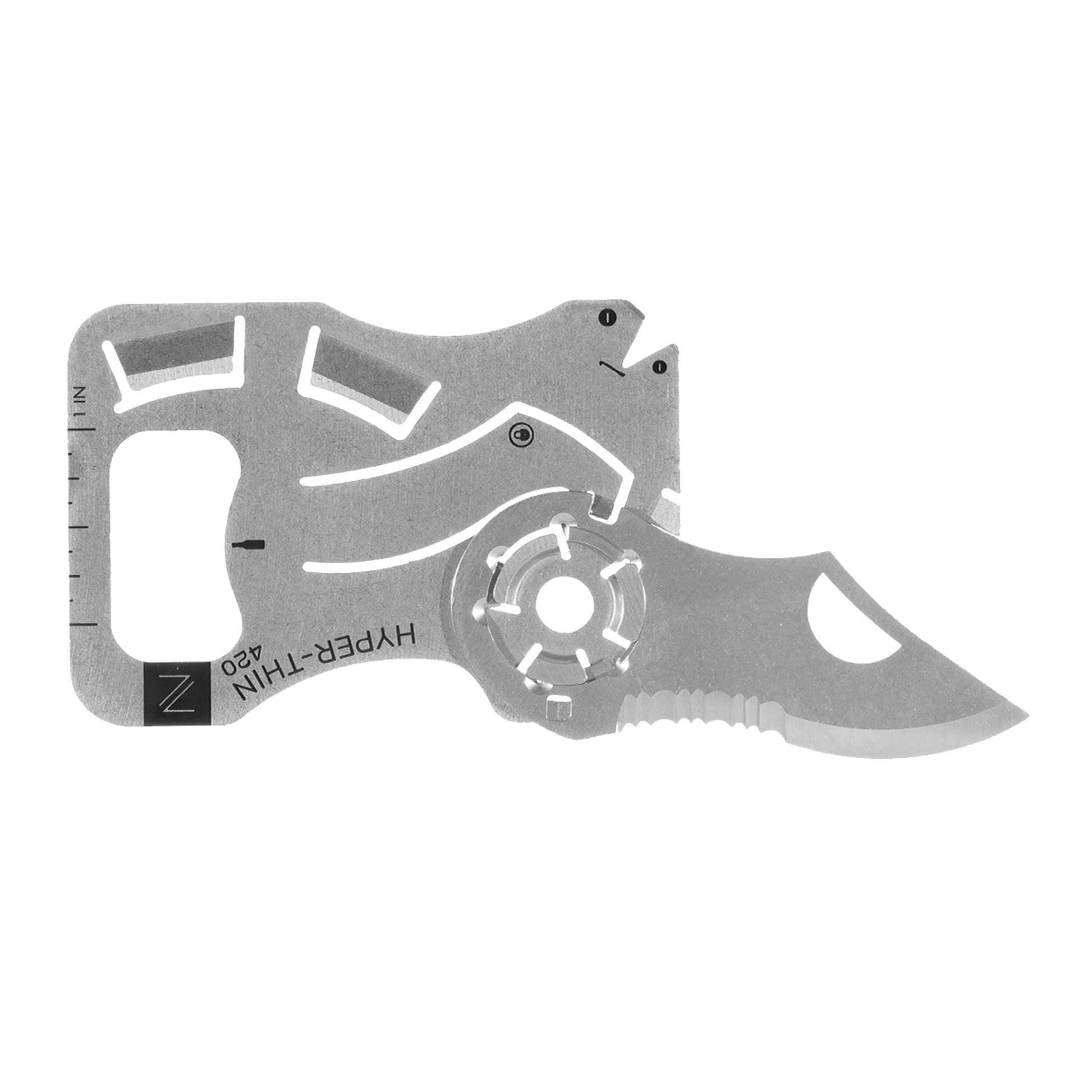 The Hyper Thin Wallet Knife is the "World's Thinnest Pocket Knife". Same as our WildCard, but without the wolf shape. The patented FlyOff technology allows you to remove the blade quickly, and the handle also includes a set of tools: