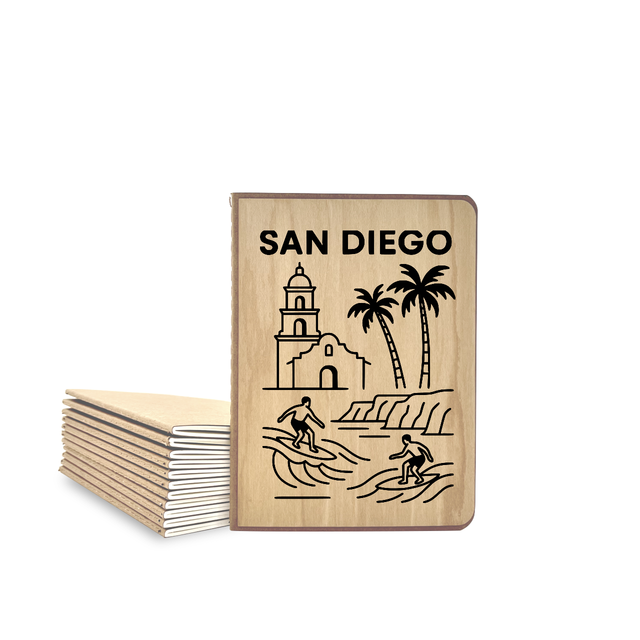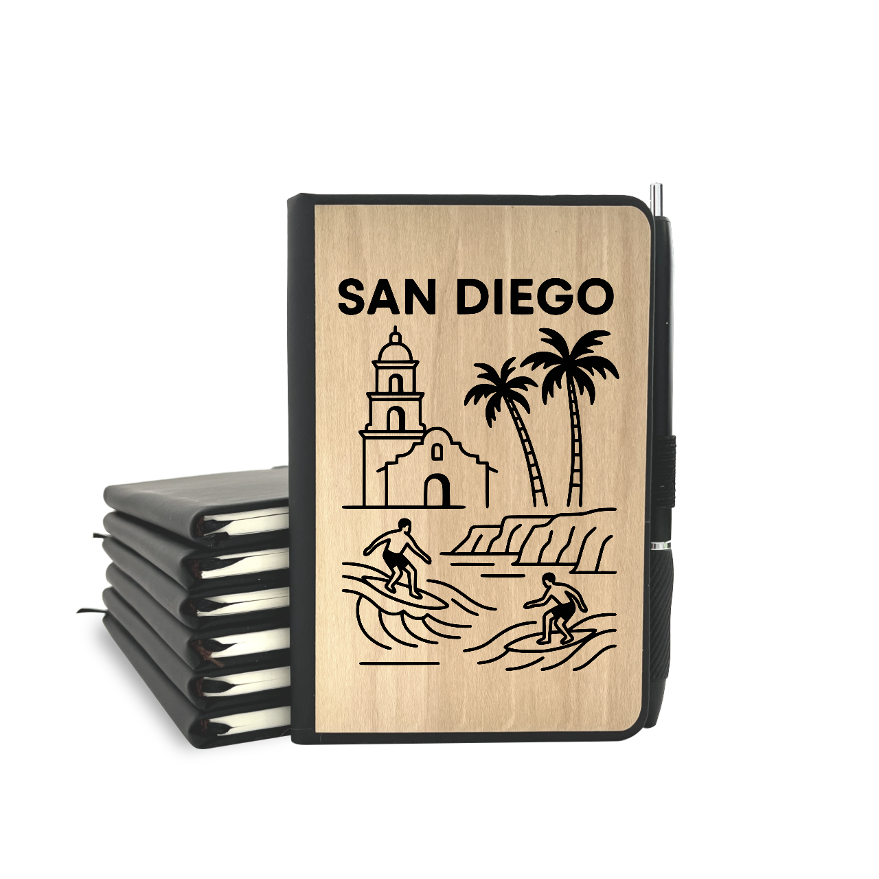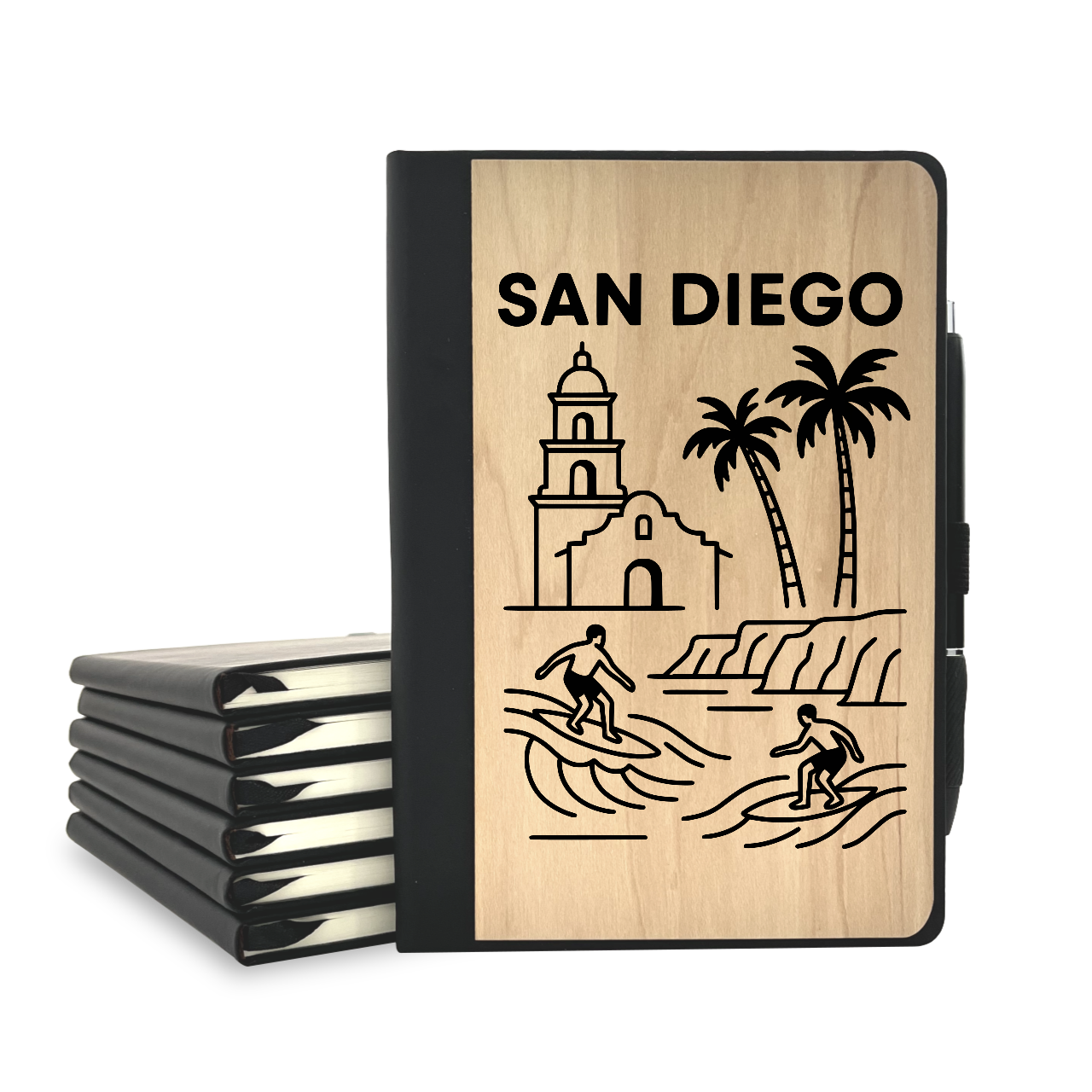 The San Diego Journal has a durable wood veneer cover with a classic design.